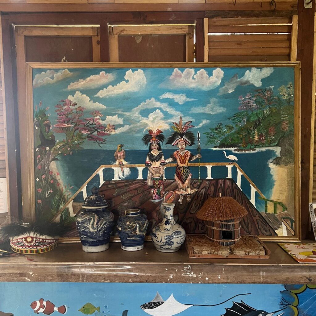 Di bagian depan ruangan tampak berbagai patung kayu dan ukiran khas Papua. Seni ukir ini biasanya dibuat dari kayu hutan lokal dan memiliki simbol-simbol yang menggambarkan hubungan manusia dengan alam, leluhur, dan roh penjaga. Ukiran tersebut bukan sekadar dekorasi, tetapi bentuk ekspresi budaya yang diwariskan turun-temurun.
